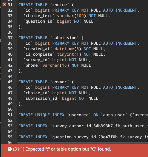좋은 점은 세미콜론이 없거나, 관계가 불분명하거나 테이블이 없다면 아래와 같이 오류가 나온다.
