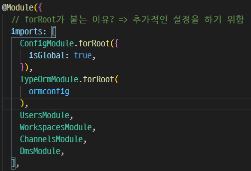 - 이 파일을 만들어주고, app.modules.ts 에서 다음과 같이 forRoot() 속성 안에 ormconfig.ts 파일을 연결(import)을 해주었다.