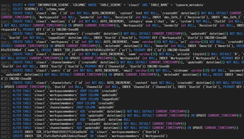 - 나는 mysql을 사용하였고, typeorm-model-generator를 사용해서 내가 사용할 DB의 스키마들을 nest에서 작성한 뒤, 그 테이블(스키마)들을 mysql로 옮겨주는 작업을 시도했다.