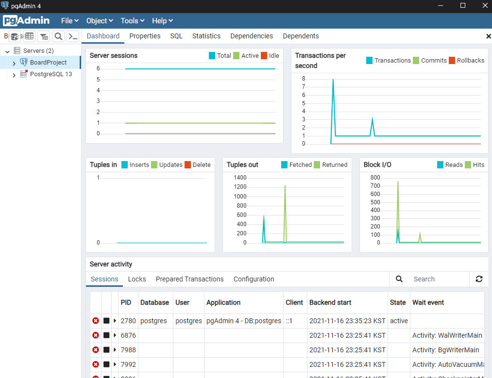 여기서 pgAdmin은 DB를 보는 도구이다.