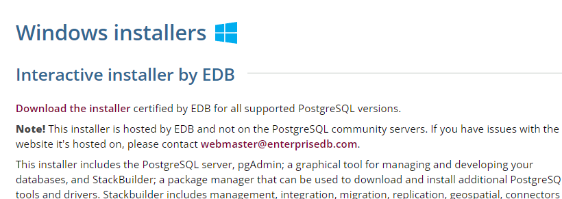 Windows installers Interactive installer by EDB Download the installer certified by EDB for all supported PostgreSQL versions. Note! This installer is hosted by EDB and not on the PostgreSQL community servers. If you have issues with the website it's hoste